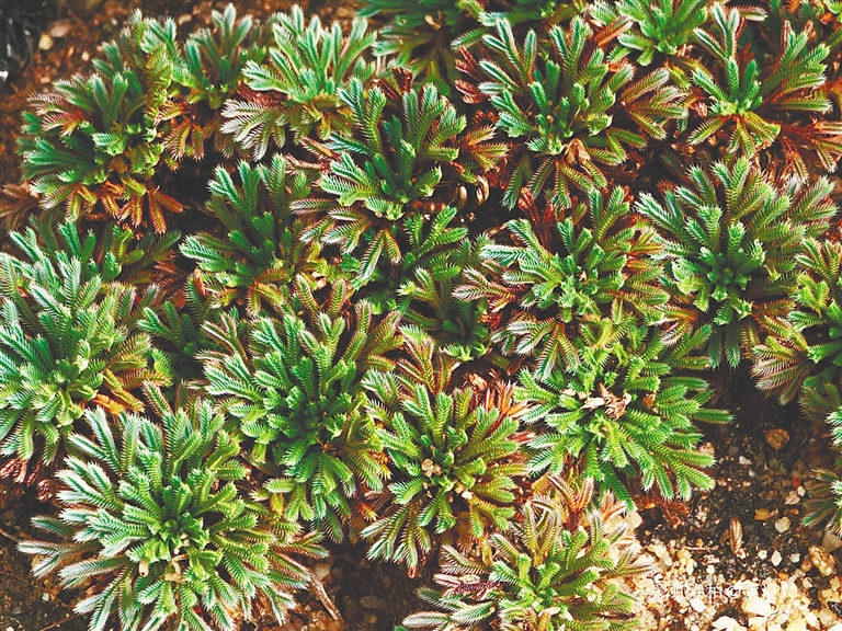 而说起彩虹卷柏名字的由来,袁浪兴分享道,因为在雨季时,当它的叶片吸饱水分展开后,会表现出彩虹般艳丽的色泽,所以把它命名为彩虹卷柏。“彩虹指它彩虹色的叶片,叫卷柏就是它干的时候卷成一团,蜷缩的样子跟其他卷柏没什么区别,吸水之后它的叶片犹如雨后彩虹,让人眼前一亮,有种惊喜感。”他说。