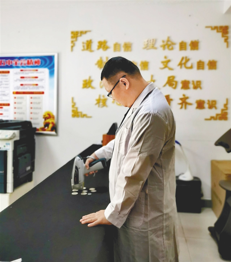文物鉴定主要依靠“眼学”,现在随着科技的发展,不少仪器也运用到文物鉴定的辅助工作中来,像笔者单位的X荧光光谱仪,可以比较准确检测金属类文物的材质,以“袁大头”的鉴定为例,不少商人铸造假银圆多是用铁等银白色金属制作,这种银币在荧光光谱仪等成分检测仪器面前很容易原形毕露,一检测便知道不是银元。有些假银元铸造也用真银,但银含量一般和真正的“袁大头”相差较大,比如铜镀银的假银元,在荧光光谱仪检测下银含量较低,铜含量很高,用砂纸磨掉表层的镀银后,可以明显看到里面的红铜。