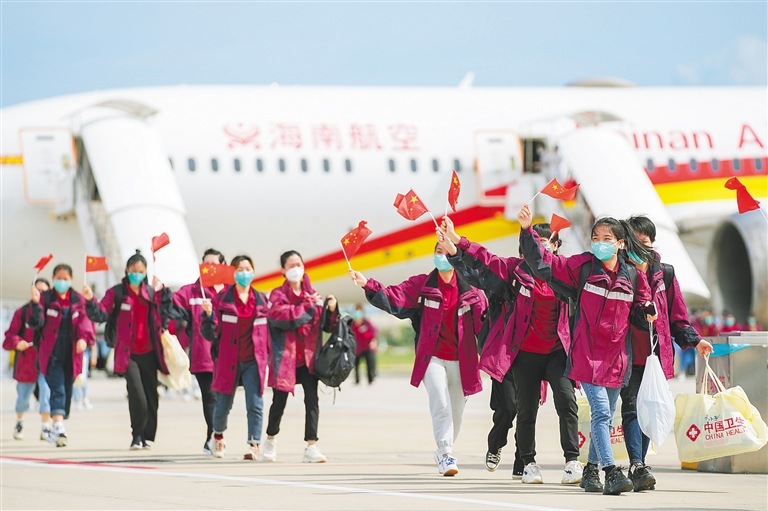 23日下午,4架载着援沪医疗队员的飞机陆续降落三亚凤凰国际机场。当第一架飞机开启舱门时,首先出现在机舱外的“海南医疗队”队旗在骄阳下显得格外鲜艳。在机场内,省委省政府为援沪英雄举行了一场简短且隆重的欢迎仪式。