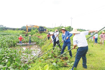 行动中,党员干部、青年团员及志愿者齐心协力、配合默契,积极发扬不怕苦、不怕累精神,认真打捞和清理水浮莲。当天共清理水浮莲20亩。