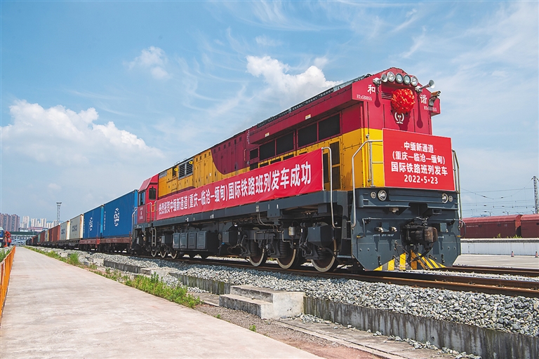 当日,中缅新通道(重庆—临沧—缅甸)国际铁路班列从重庆果园港鱼嘴车站驶出,标志着中缅新通道(重庆—临沧—缅甸)正式开通。