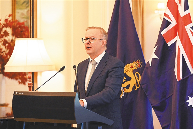 5月23日,澳大利亚新任总理安东尼·阿尔巴内塞在位于堪培拉的总督府发表讲话。
