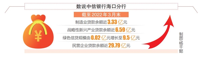 精准滴灌,支持国家重点区域大战略。在服务海南自由贸易港建设的进程中,中信海口分行充分发挥集团金融全牌照、实业全链条优势,倾力服务国家重大战略布局,持续深化对“一带一路”、海南自由贸易港等国家重大战略区域的金融支持力度,助力区域可持续高质量发展,助推国内大循环为主体、国内国际双循环相互促进的新发展格局。一是着眼大局,持续加大制造业信贷投放力度。多措并举确保制造业贷款整体规模稳步增长,支持先进制造业发展和传统制造业转型升级。截至2022年3月末,该行制造业贷款余额近3.33亿元,战略性新兴产业贷款余额近6.59亿元,向辖内多家高新技术企业及“专精特新”小巨人企业提供综合融资服务。二是聚焦双碳,加速绿色金融发展。该行秉承“绿水青山就是金山银山”的发展理念,强化业务发展绿色转型,积极支持绿色产业,不断提高绿色贷款规模和占比。持续加大对节能环保产业、清洁生产产业、清洁能源产业、生态环境产业、基础设施绿色升级、绿色服务等6大绿色产业的信贷投入。截至2022年3月末,该行绿色信贷短期内实现较大突破,两年内绿色信贷规模由0.02亿元增长至9.5亿元。三是坚守初心,与民营企业共成长。该行上下全力推动金融服务民营企业工作,助力民营经济发展行稳致远。截至2022年3月末,该行民营企业贷款余额近29.79亿元。
