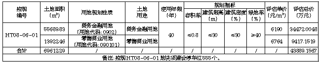 根据有资质的土地评估中介机构评估,并经评估专家小组评审通过,该宗地的土地评估总价为43889.1567万元。其中:1.商务金融用地土地评估单价为6190元/m2(折合412.67万元/亩),土地评估总价为34472.0048万元;2.零售商业用地土地评估单价为6764元/m2(折合450.93万元/亩),土地评估总价为9417.1519万元。