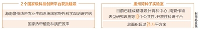 农业科技创新平台不断夯实。国家耐盐碱水稻技术创新中心在三亚挂牌运行。海南儋州热带农业生态系统国家野外科学观测研究站和国家热带植物种质资源库2个国家级科技创新平台获批建设。争取热带农业生物资源保护与利用省部共建国家重点实验室。成立崖州湾种子实验室,目前已建成精准设计育种中心、南繁作物表型研究设施等10个公共性、开放性科研平台,总面积超过24万平方米,成为我国集中连片、体系配套、设备先进、有影响力的种业创新平台。全省共有涉农重点实验室41家,涉农院士工作站42家。