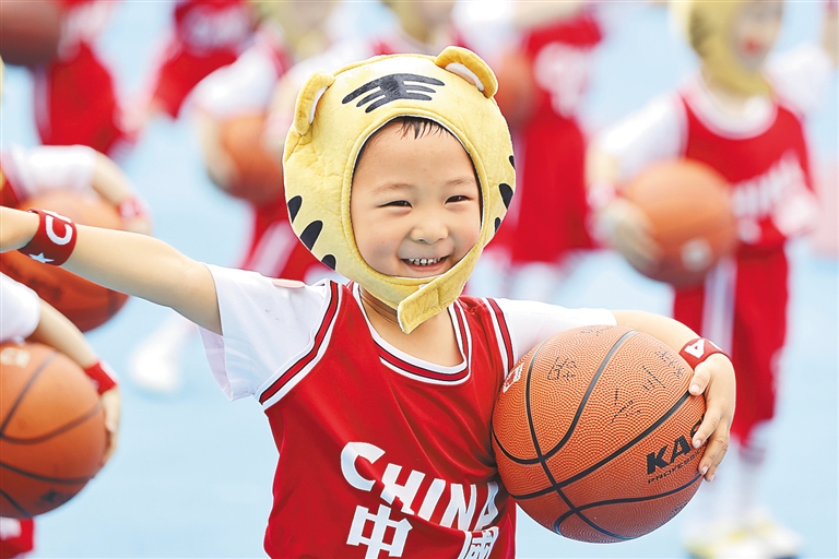 5月27日,在江西省吉安市峡江县幼儿园,小朋友参加快乐篮球赛。