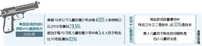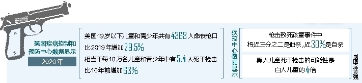 美国疾病控制和预防中心数据显示,在已有汇总数据的最近一个年份,即2020年,美国19岁以下儿童和青少年共有4368人命丧枪口,比2019年增加29.5%,相当于每10万名儿童和青少年中有5.4人死于枪击,比10年前增加63%。