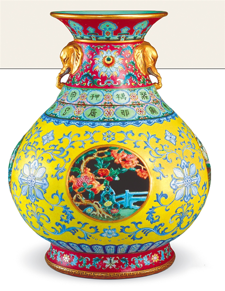 转心瓶的彩饰,口部以及象耳的金彩有赤金的质感,瓶体在不同色地上以珐琅彩料描绘了花卉图案。四圆开光各以春、夏、秋、冬园林景致为题材,镂雕的花卉、山石以粉彩描绘。瓶里饰松石绿釉,足底画青花六字篆款“大清乾隆年制”。