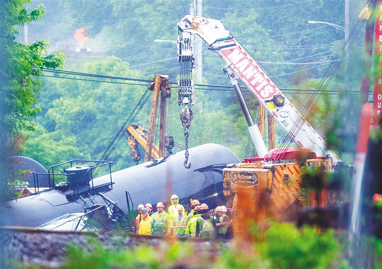 5月27日,在美国宾夕法尼亚州哈马,工人在火车脱轨事故现场清理脱轨的车厢。