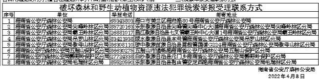 为深入推进海南热带雨林国家公园(以下简称“国家公园”)建设,依法查处涉森林和野生动植物资源案件,切实维护国家公园森林生态安全,现向社会开通国家公园区域内举报破坏森林和野生动植物资源违法犯罪线索渠道。希望广大群众积极参与,并提供违法犯罪线索。警方将对提供线索人员的信息严格保密。