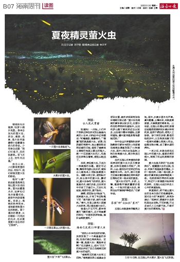 “我和小伙伴在玩的时候,突然发现了一个亮晶晶的东西,在我们旁边晃来晃去。定睛一看,是萤火虫!真是幸运啊!”社交媒体上,名叫“贝贝”的网友讲述了自己在海南见到萤火虫的经历。