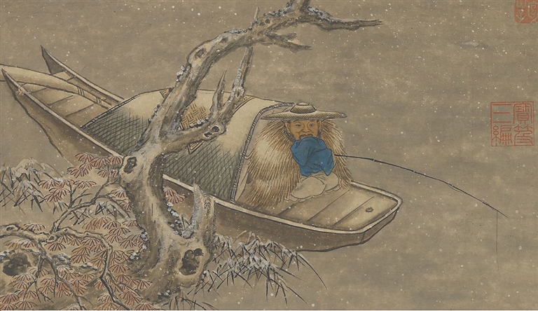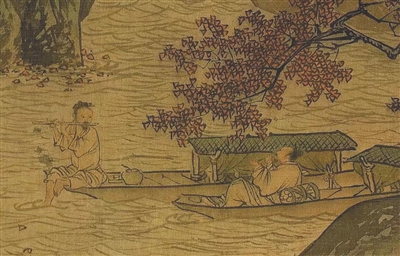 这画绘芦汀草岸,画面正中绘一船停泊,画中文士从乌篷中探头而出,旁侧仆童侍立,船夫摇桨停靠岸边。画中心的小船,应是一艘书画船。从船中乌篷小窗中,隐约可见一案几、一茶壶、几册书,几丛盆菊,表明这是个典型文人休闲娱乐空间。
