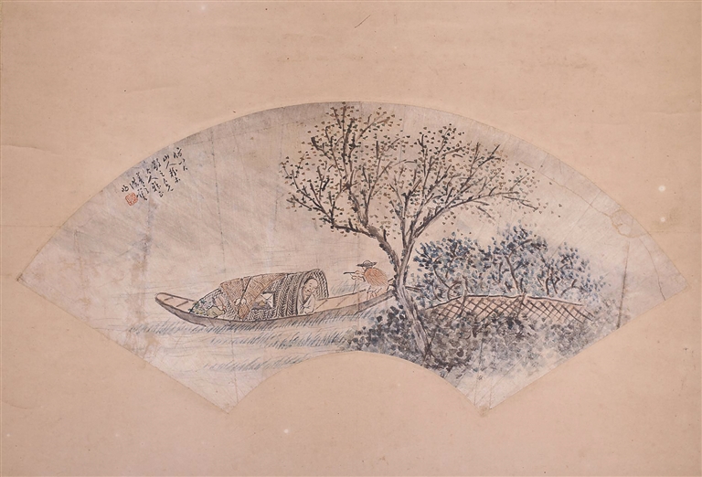 一日在整理文物普查数据库时,发现一幅清代山水扇面,画面正中的小船颇具情志,不由得思绪被它载着,走向那幽幽的时空里……