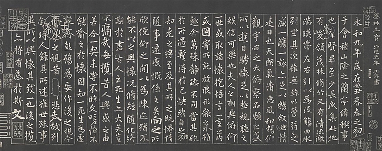 在清代时,这卷传奇的“落水”《兰亭》深受乾隆皇帝的喜爱,并御书题了引首“山阴真面”四字,并命人将此本摹刻上石,成了《清·内府摹刻赵子固落水(兰亭)卷》,拓本至今藏于故宫博物院。吹过书画船帆的风雅不断,一代又一代续写文人的故事。