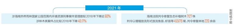 2021年,海南法院判令修复生态补植树木7127株,判令以增殖放流形式放流鱼苗、虾苗等455179尾,判令修复林地220余亩,生态修复取得明显成效。
