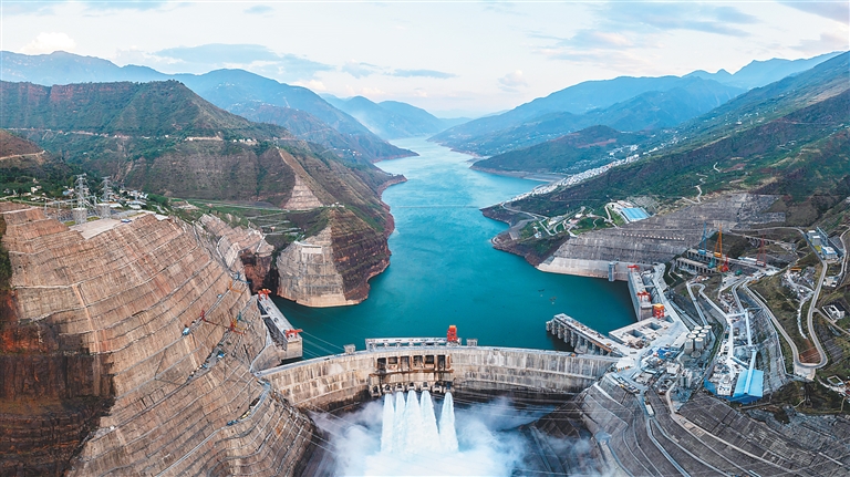 5月30日,白鹤滩水电站左岸地下厂房5号机组顺利通过72小时试运行,正式投产发电。据了解,这是白鹤滩水电站投产的第8台机组,标志着这座水电站一半机组已投产。图为白鹤滩水电站一景。新华社记者 胡超 摄