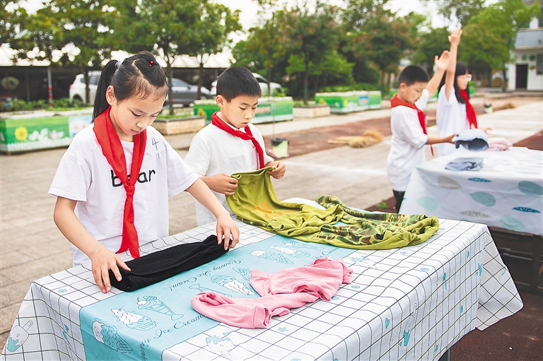 5月30日,河洑镇汇华聚宝小学的学生参加叠衣服比赛。