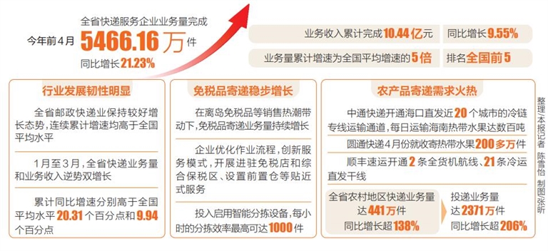 本报讯(记者陈雪怡 通讯员胡小曼 于祥汝)省邮政管理局日前公布的数据显示,今年前4月全省快递服务企业业务量完成5466.16万件,同比增长21.23%;业务收入累计完成10.44亿元,同比增长9.55%;业务量累计增速为全国平均增速的5倍,排名全国前5,邮政快递业发展呈现出稳中有进、进中提质的良好态势。