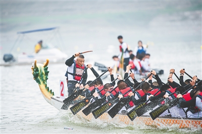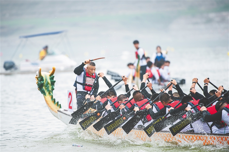 6月3日,2022年“屈原故里”中国龙舟争霸赛(宜昌)在湖北省宜昌市秭归县三峡大坝前举行,来自湖北、湖南、江西、广东等地16支龙舟队伍的400多名选手乘风逐浪、一决高下。图为龙舟赛现场。新华社发(伍志尊摄)