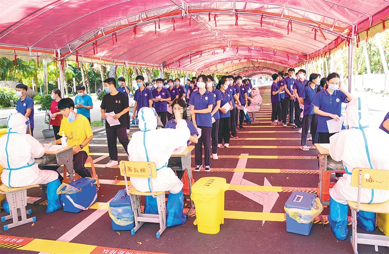 6月5日,万宁中学师生与高考工作人员接受核酸检测。 通讯员 杨师忠 摄