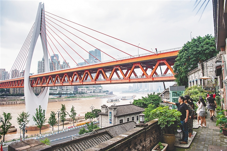 6月4日,人们在长江边的龙门浩老街景点游玩,远处是重庆地标性建筑东水门长江大桥。