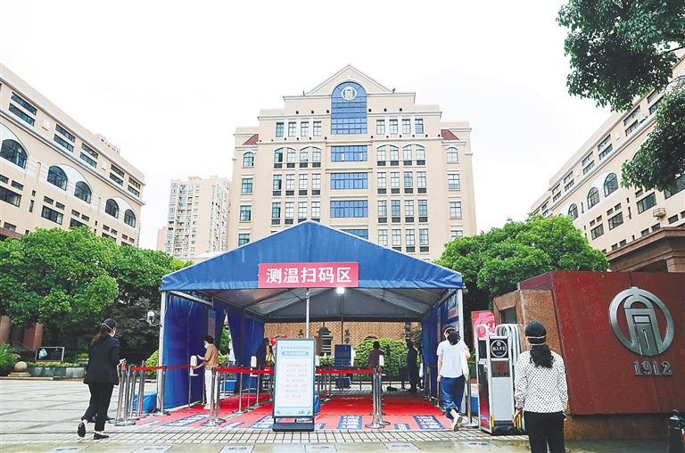 上海全市高三、高二年级学生从6月6日起返校复学,不做强制要求,学生可返校复学也可居家线上学习。此前,上海已发出通知,秋季高考统考延期至7月7日至9日举行。图为6月5日,上海市大同中学的教师们在演练入校流程。新华社记者 刘颖 摄