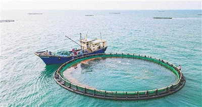 近日,位于昌江黎族自治县海尾镇的临高春威实业有限公司海尾镇养殖基地,工人在给鱼苗喂料。海尾镇积极引进渔业企业,通过公司+村集体经济合作模式,发展现代渔业,引导村民从近海养殖走向深海,助力渔业产业转型升级,实现生态保护与乡村产业振兴双赢。本报记者 陈元才 通讯员 杨耀科 图/文