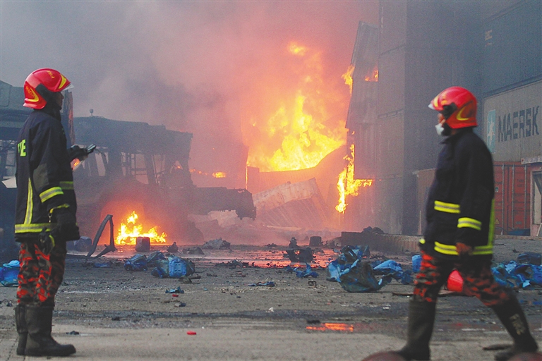 6月5日,消防员到达孟加拉国吉大港地区集装箱堆场火灾现场。