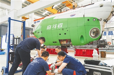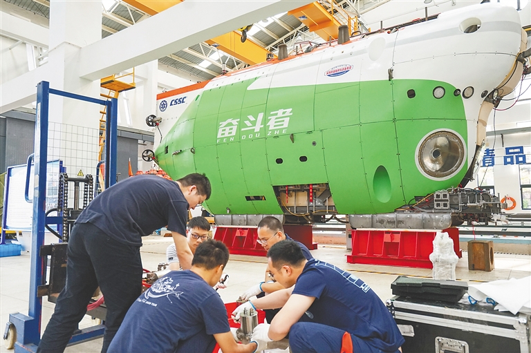 现场,中科院深海所实验室钳工、高级技师周皓正在带领多名技术人员,围着“深海勇士”号载人潜水器进行检修维护。他们工作服都已经湿透。