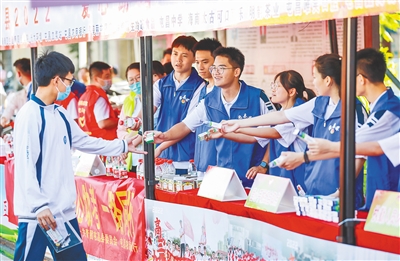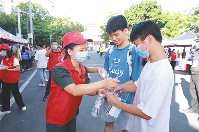 在万宁中学考点,志愿者为考生送上饮用水。 杨师忠 摄
