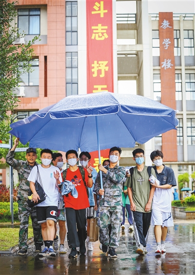 在北京师范大学海口附属学校考点,退役军人志愿者在雨天里为走出考场的考生撑起大伞。 本报记者 张茂 摄