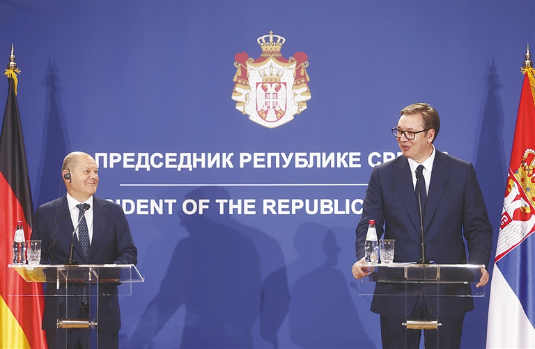 塞尔维亚总统武契奇10日在首都贝尔格莱德与到访的德国总理朔尔茨会晤后表示,关于制裁俄罗斯,塞尔维亚与欧盟持不同立场。武契奇在与朔尔茨共同举行的新闻发布会上说,德国总理以“明确、清晰、强硬的态度”要求塞尔维亚加入欧盟对俄制裁并表示将在能源领域对塞尔维亚提供帮助,但关于制裁俄罗斯,塞方有着不同立场。新华社发
