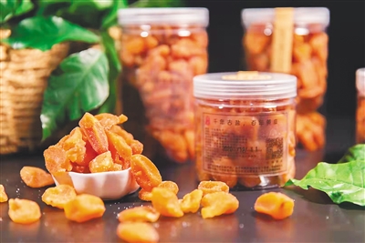 黄皮果干。儋州当地一些返乡青年,带回出岛闯荡多年的经验,投入到黄皮干研发中。他们和有生产资质的厂家合作,采用新鲜黄皮人工去籽,加盐和糖腌制晾晒60天以上制作成干果。黄皮干具有生津止渴、化痰平喘、健脾和胃、疏风解表等功效,对消化不良、腹胀、咳嗽等有很好的改善效果。儋州“儋礼”黄皮特产店通过借助互联网渠道,一年能卖超6万罐黄皮干。