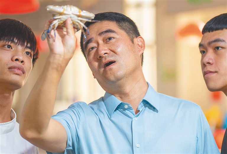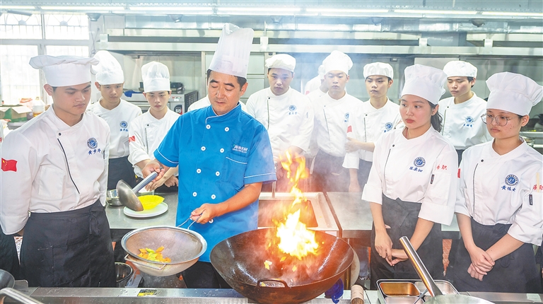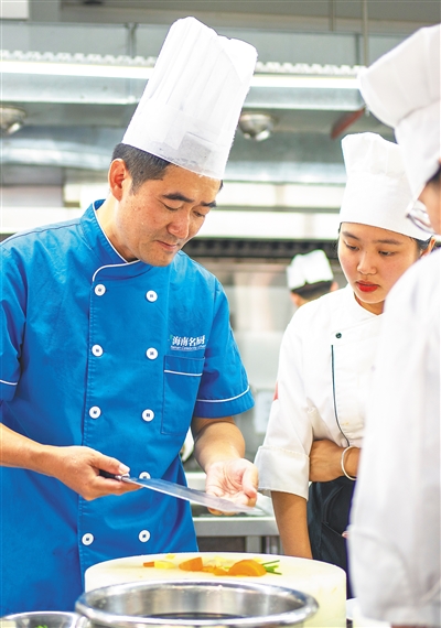 6月的海南,夏日炎炎。在海南职业技术学院烹饪教室,纪宽宏娴熟地烹饪出一份份色香味俱全的菜肴,炉火照亮了他和学生的脸庞,豆大的汗珠从他额头滑落。他认真地向学生讲解火候与菜色、成熟度、口感和营养的关系。