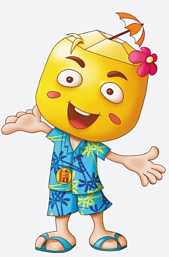 “金椰娃”卡通形象以“喝椰子”为创意元素并使之拟人化,配以浓厚海南热带风情特色的服饰,头部装饰太阳伞及花朵(三角梅配色),突显海南阳光沙滩的热带海岛风情,极富海南特色。胸前悬挂“信”字吊牌作为基础形象里的征信相关元素,吊牌设计参考海南旅游业导游工作证,整个卡通形象就像导游一般向大众介绍征信知识,传播征信正能量。