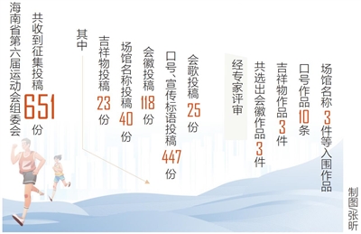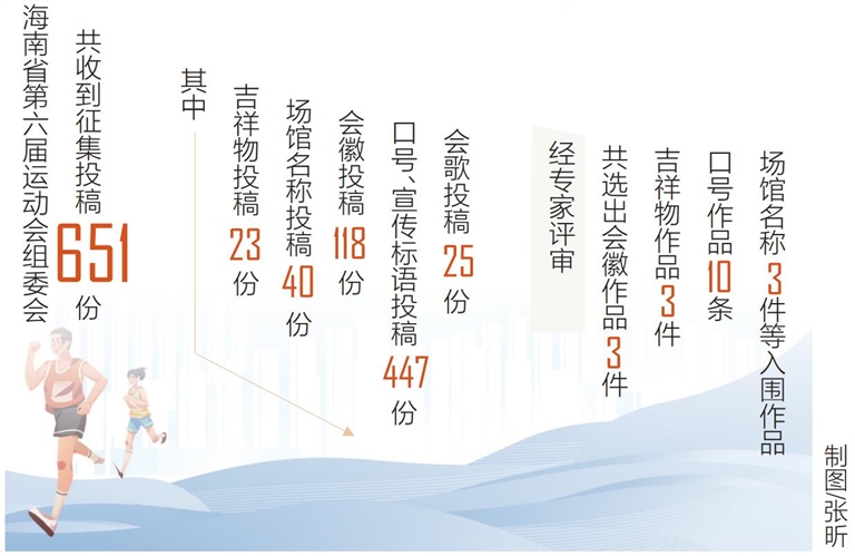 “投稿人来自不同省份、不同领域,他们中间有优秀设计师,也有设计爱好者,每一件作品都深深地表达了他们对海南儋州的热爱,对健康省运的向往。”组委会相关负责人表示。自今年1月1日发布《海南省第六届运动会会徽、口号、吉祥物、会歌及场馆名称征集方案》以来,组委会共收到征集投稿651份,其中吉祥物投稿23份,场馆名称投稿40份,会徽投稿118份,口号、宣传标语投稿447份,会歌投稿25份。