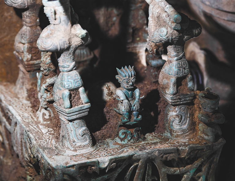 目前三星堆3、4号“祭祀坑”已结束野外发掘,5、6号“祭祀坑”正在开展埋藏文物的室内清理,此次公布的文物主要集中在7、8号“祭祀坑”。其中7号“祭祀坑”发现了被考古学家称为“月光宝盒”的龟背形网格状器,成捆的长条状玉凿、三孔玉璧形器、玉斧、玉瑗,铜顶璋龙形饰、小件的青铜凤鸟、青铜立人、铜铃等。与7号“祭祀坑”邻近的8号“祭祀坑”大件青铜器更多,包括金面罩铜头像、顶尊蛇身铜人像、精妙复杂的铜神坛、“机器狗”一样的铜巨型神兽、铜龙、“裹裙坎肩大背头”的铜立人像、铜猪鼻龙形器、铜戴象牙立人像、铜神殿形器盖、石磬等,数件文物都是世界上首次发现。