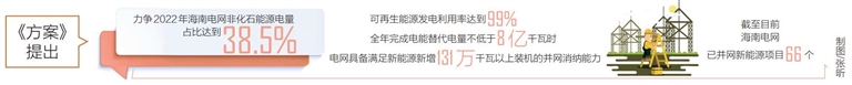 为服务保障清洁能源消纳,《方案》从推进能源结构清洁化发展、加强电网建设、推进终端用能电气化三大方面提出16项举措,涵盖大力支持新能源发展、完善新能源项目服务机制、服务好整县(市、区)分布式光伏开发试点项目建设、强化调峰能力建设、积极参与西电东送、加快清洁能源送出通道建设、深化开展电能替代业务等措施;力争2022年海南电网非化石能源电量占比达到38.5%,可再生能源发电利用率达到99%,全年完成电能替代电量不低于8亿千瓦时;电网具备满足新能源新增131万千瓦以上装机的并网消纳能力。