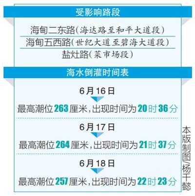 本报海口6月15日讯 (记者习霁鸿)海南日报记者6月15日从海口市排水设施事务中心获悉,受潮汐影响,6月16日~6月18日,海口地势较低的海甸二东路(海达路至和平大道段)、海甸五西路(世纪大道至碧海大道段)和盐灶路(菜市场段)等三条路段可能会出现海水倒灌,路面会积水深10厘米至20厘米。建议市民开车时绕行上述路段,途经时减速慢行。