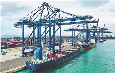 巨轮靠泊,岸桥伸缩,洋浦国际集装箱码头一派繁忙。