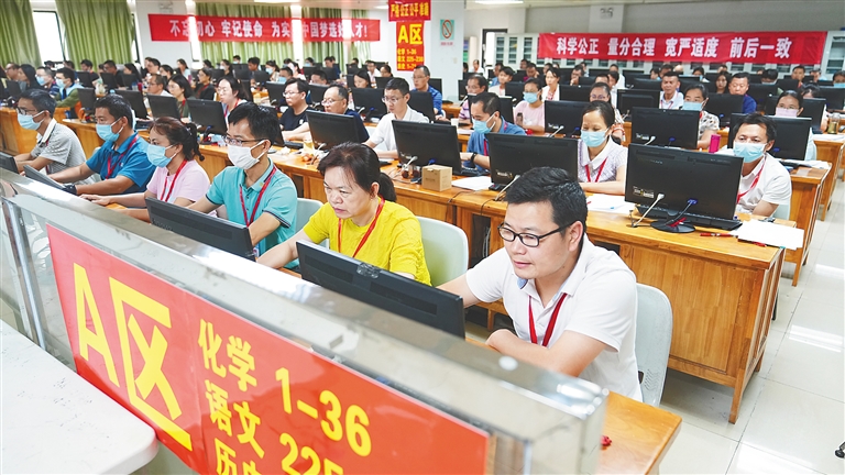 “我们加强对评卷老师的培训,各学科组反复分析、研究,制定出统一的评分标准和评分细则,经过试评和测试考核,真正做到把国家规范、我省细则和各科目评分标准吃透。其中,对试评不合格的评卷员进行再培训,培训后仍不合格的予以辞退。正式评卷期间,各评卷老师则严格按照评分细则评阅每一道题、每一张卷。”杨京文说,为加强对评卷过程规范性和误差合理性的控制,评卷期间,质检员还根据评分分布等6个指标情况,对每位评卷员的评卷质量进行监控,确保评阅科学、准确、客观、公正。