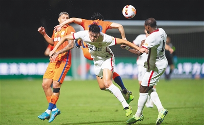 图为长春亚泰队队员和山东泰山队队员拼抢。