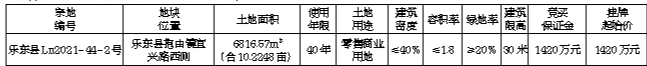 二、中华人民共和国境内外的公司、企业、其他组织及自然人均可参加竞买,法律、法规另有规定的除外。属境外法人或其他组织的,须提供境外公证部门的公证书。在乐东黎族自治县行政辖区内有闲置建设项目用地或拖欠土地出让金及失信被执行人不得参加竞买。三、本次国有土地使用权挂牌出让按照价高且不低于底价者得原则确定竞得人。四、本次挂牌出让的详细资料和具体要求,见《国有建设用地使用权挂牌出让手册》。有意竞买者可于2022年6月17日至2022年7月26日到乐东黎族自治县抱由镇江北区自然资源和规划局大楼二楼土地储备整理中心或海南天悦拍卖有限公司咨询和领取《国有建设用地使用权挂牌出让手册》。五、申请人可于2022年6月17日至2022年7月26日下午16:00到乐东黎族自治县抱由镇江北区自然资源和规划局大楼二楼土地储备整理中心或海南天悦拍卖有限公司提交书面申请。交纳竞买保证金的截止时间为2022年7月26日16:00(以到账为准)。经审核,申请人按规定交纳竞买保证金,具备申请条件的,我局将在2022年7月26日17:00前确认其竞买资格。六、本次国有土地使用权挂牌活动在海南省政府会展楼二楼省公共资源交易服务中心土地交易厅举行。地块挂牌时间:2022年7月18日9:00至2022年7月28日10:00;挂牌现场会时间:2022年7月28日10:00。七、其他需要公告的事项:(一)竞买成交当天签订《成交确认书》,并在10个工作日内与我局签订《国有建设用地使用权出让合同》。成交价款不含各种税费(双方的印花税由竞得者缴纳),其他税费按规定缴交。(二)按照海南省国土资源厅、海南省发展和改革委员会、原海南省规划委员会、海南省工业和信息化厅、海南省财政厅、海南省商务厅、国家税务局海南省税务局《关于印发<海南省建设用地出让控制指标(试行)>的通知》(琼国土资规〔2018〕7号)有关规定,该宗地块属于房地产业零售商业项目,因此拟设定该宗地块投资强度指标为250万元/亩,年度产值及年度税收不设指标,项目达产时间为签订《国有建设用地使用权出让合同》后的3年内。以上控制指标按规定列入《产业项目发展和用地准入协议》,属于协议内容的组成部分,竞得人在取得土地使用权后,在签订《国有建设用地使用权出让合同》同时与产业主管部门乐东黎族自治县住房保障与房产管理局签订《产业项目发展和用地准入协议》,并严格按照《产业项目发展和用地准入协议》约定内容进行开发建设,否则将承担相关违约责任。(三)竞得人自取得土地使用权之日起一年内动工开发建设,自开发建设之日起两年内完成项目建设;须严格按照规划部门批准的规划设计要求进行开发建设;如造成土地闲置,按照《海南自由贸易港闲置土地处置若干规定》执行。(四)该宗地块土地权属清晰,征地补偿安置落实到位,地上附着物已全部补偿完毕,无法律经济纠纷、符合净地出让条件,地块周边可以满足施工建设的水、电供应,相关设备、机械可以进场施工的土地条件。(五)地块采用装配式建筑方式建造。(六)本次挂牌出让不接受电话、信函、电子邮件及口头申请,不接受邮寄文件。(七)本公告所指时间均为北京时间。(八)详细情况请登录http://www.landchina.com/、http://www.ggzy.hi.gov.cn、http//lr.hainan.gov.cn、 http://ledong.hainan.gov.cn/。(九)本公告未尽事宜,详见《国有建设用地使用权挂牌出让手册》,该手册所载内容为本公告的组成部分。八、联系方式:联系地址:海南省乐东黎族自治县抱由镇江北区自然资源和规划局大楼二楼土地储备整理中心;联 系 人:林先生 李先生;联系电话: 0898-85531814 18508955059。