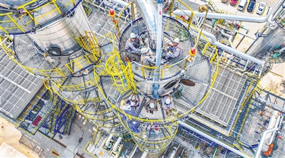 近日,洋浦经济开发区海南炼化100万吨乙烯项目施工场面热火朝天。目前,该项目总体进度完成超九成,正在进行相关设备安装和调试工作。该项目建成投产后,预计可拉动超过1000亿元下游产业。图为工作人员在高空安装设备。