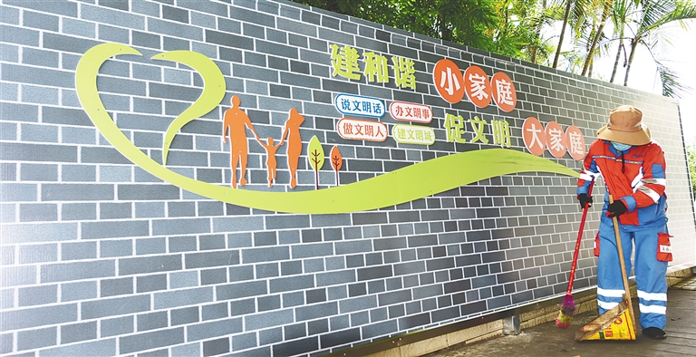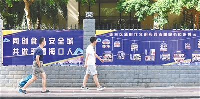 6月16日,在海口市美兰区白龙街道桫椤湾娱乐艺术风情街,崭新的公益广告扮靓街区。