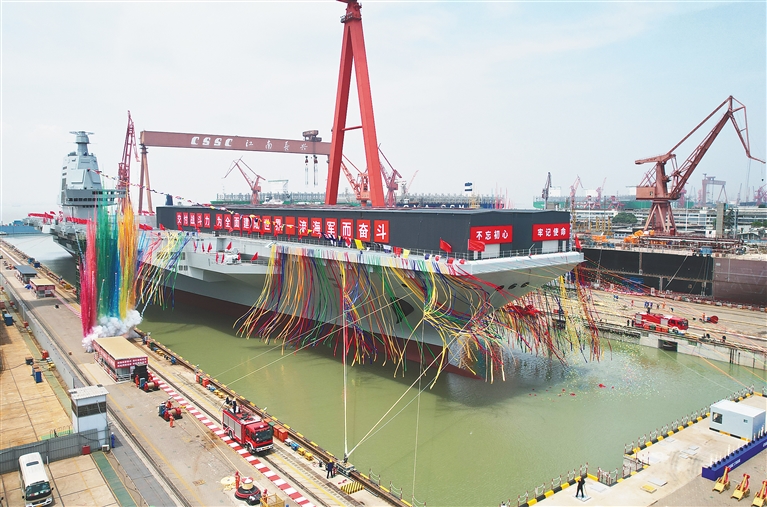 经中央军委批准,我国第三艘航空母舰命名为“中国人民解放军海军福建舰”,舷号为“18”。福建舰是我国完全自主设计建造的首艘弹射型航空母舰,采用平直通长飞行甲板,配置电磁弹射和阻拦装置,满载排水量8万余吨。该舰下水后,将按计划开展系泊试验和航行试验。