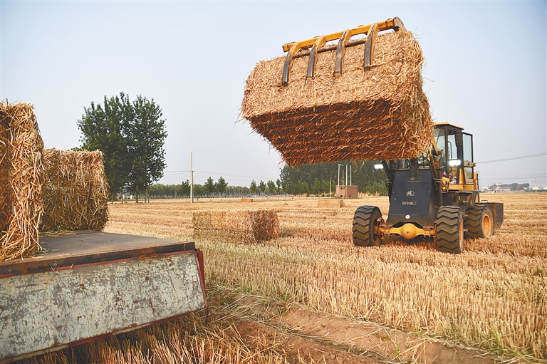 6月17日,在河北省石家庄晋州市周家庄乡的小麦田里,农民在打包回收小麦秸杆。