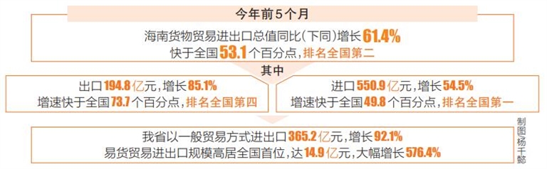 本报讯(记者周晓梦 通讯员林柏荣)今年前5月,我省货物贸易进出口总值745.7亿元。海口海关近日公布的统计数据显示,今年前5个月,海南货物贸易进出口总值同比(下同)增长61.4%,快于全国53.1个百分点,排名全国第二。
