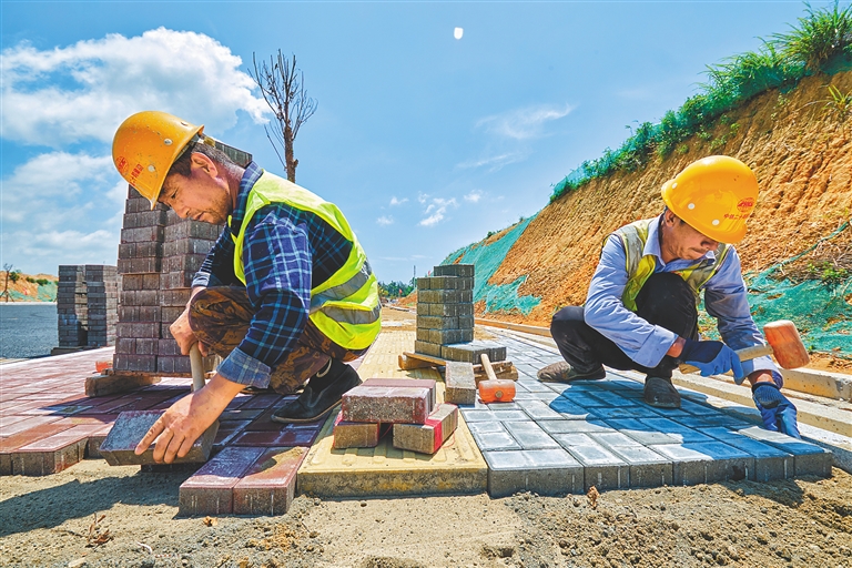 ② 文昌国际航天城起步区“三横五纵”路网工程(一期)项目现场,施工人员在路面铺砖。