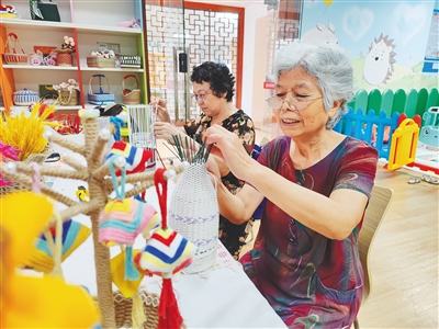 6月14日,新安社区老年人活动室里,彩绳在黄阿姨灵巧的指尖缠绕,没多久,一个编织瓶雏形显现。指着展示台上一只只精巧的编织花篮,黄阿姨兴奋地说:“这些都是我和我的‘老伙伴’做的,数量积攒够了,社区就拿去义卖,收来的费用用作志愿活动经费,我们也算是做了好事。”
